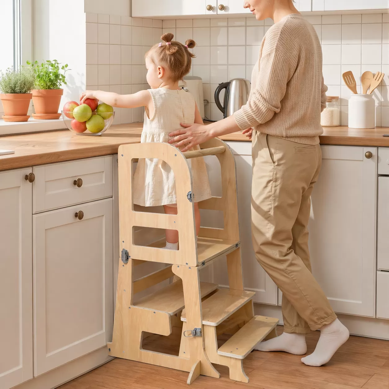 Ένας βοηθητικός πύργος / σκαμνί φέρνει ένα παιδί στο κατάλληλο ύψος για να εργαστεί στον πάγκο της κουζίνας.