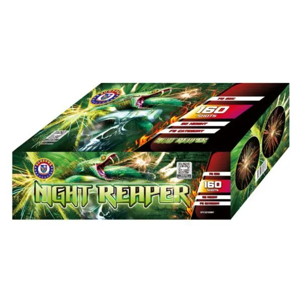 Τα πυροτεχνήματα Night Reaper SFC2016M1 εκτοξεύουν 160 εναέριες βολές μέσα σε 55 δευτερόλεπτα. Το θέαμα που μας προσφέρουν είναι πρωτόγνωρο για ένα τόσο οικονομικό πυροτέχνημα. Μεγάλο ύψος, δυνατοί κρότοι, μεγάλα ανοίγματα και ισχυρό φινάλε.