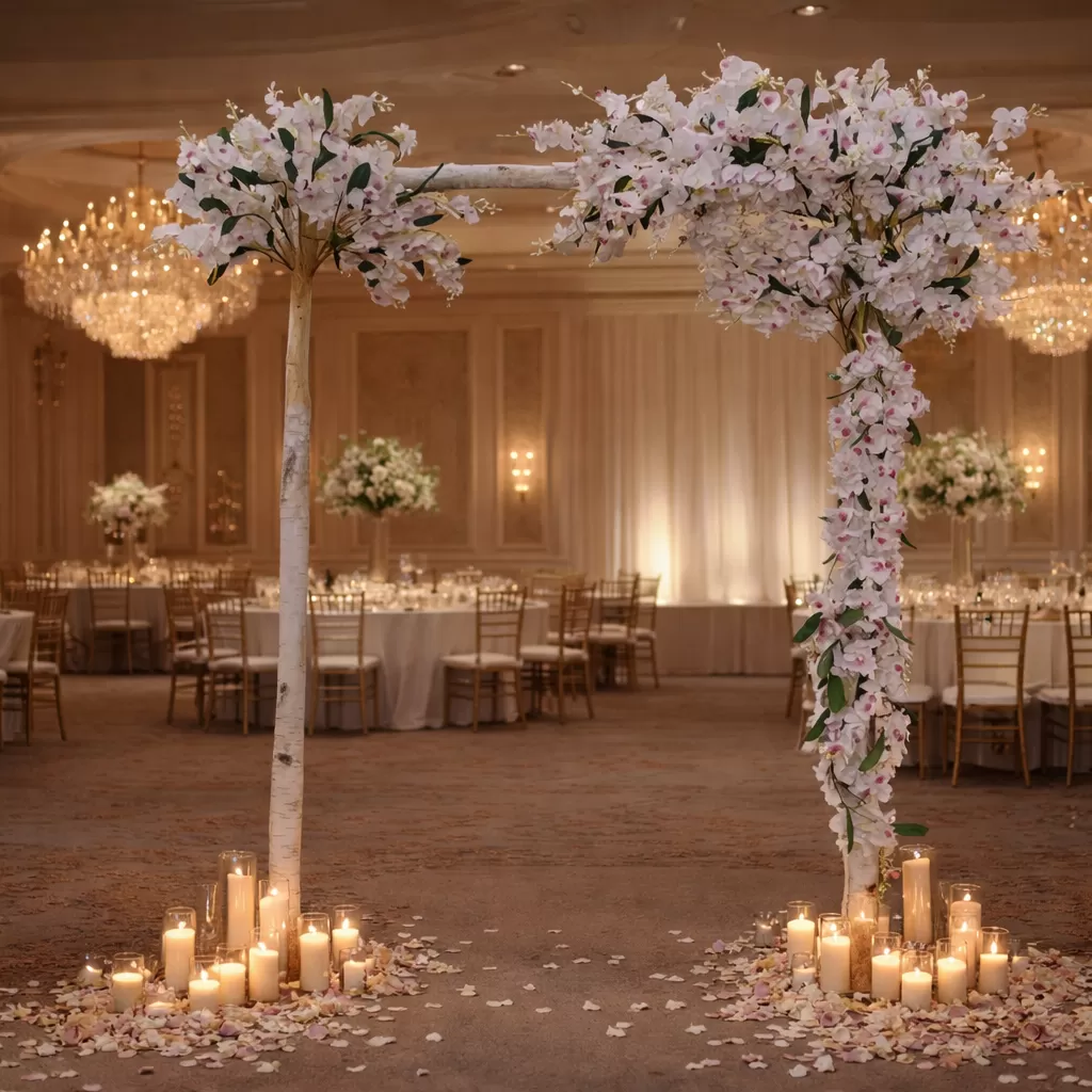 Τα άνθη ορχιδέας προσδίδουν μια αίσθηση πολυτέλειας και φρεσκάδας, ενώ η αψίδα από σημύδα δημιουργεί ένα φυσικό και κομψό αποτέλεσμα που ταιριάζει τόσο σε κλασικούς όσο και σε μοντέρνους χώρους.